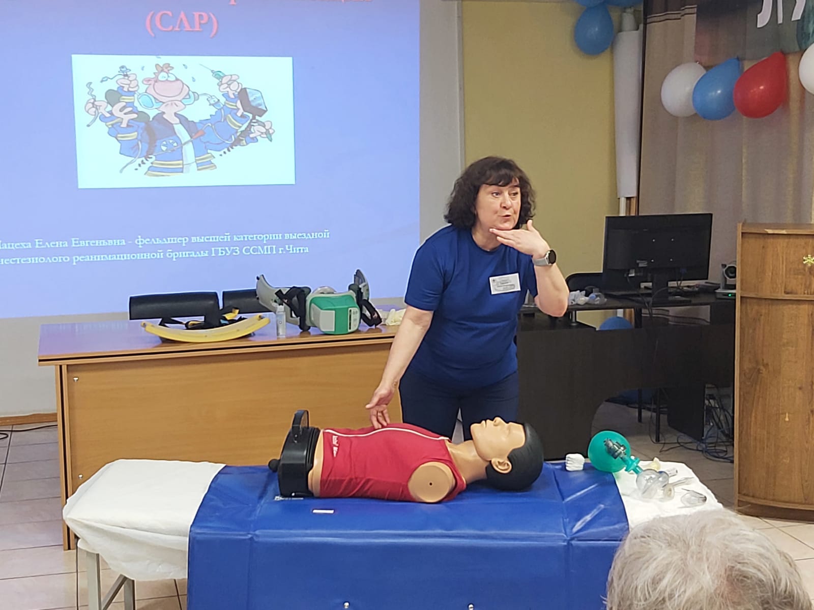 1. Практикум «Сердечно-легочная реанимация взрослым пострадавшим» провела: Мацеха Елена Евгеньевна - фельдшер анестезиолого-реанимационной бригады ГБУЗ «Станция скорой медицинской помощи», высшая квалификационная категория по специальности «Скорая неотложная помощь», победитель Всероссийского конкурса «Лучший специалист со средним медицинским и фармацевтическим образованием» в номинации «Лучший фельдшер» в 2019 году.