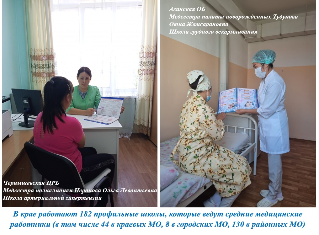 Всего в крае работают 182 профильные школы, которые ведут только средние медицинские работники (в том числе 44 в краевых МО, 8 в городских МО, 130 в районных МО).